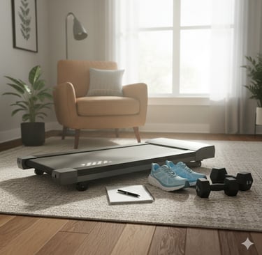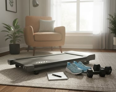 I’ll use a small walking pad for daily movement, wear my Hoka shoes for comfort, and do strength exercises with 5-lb and 8-lb dumbbells.